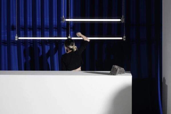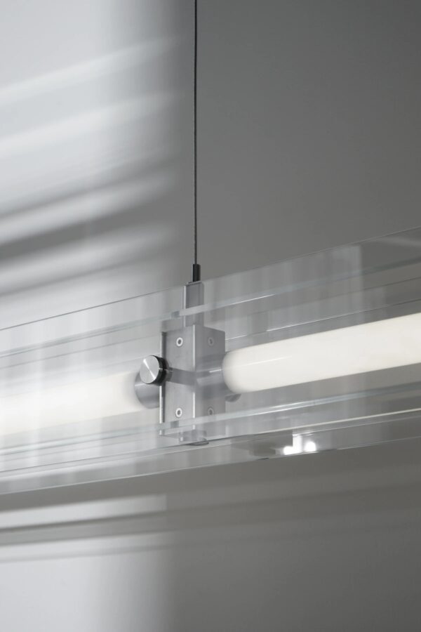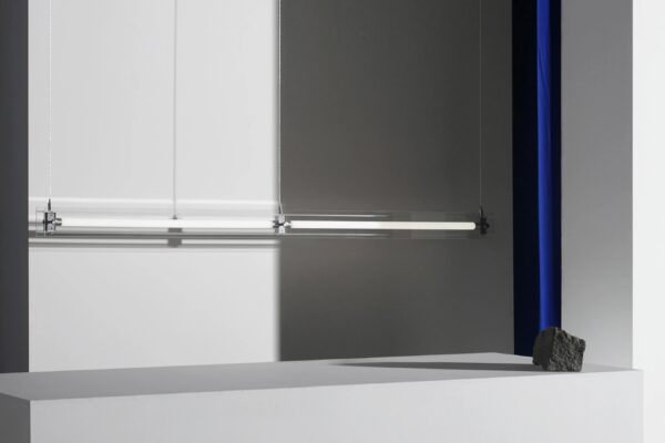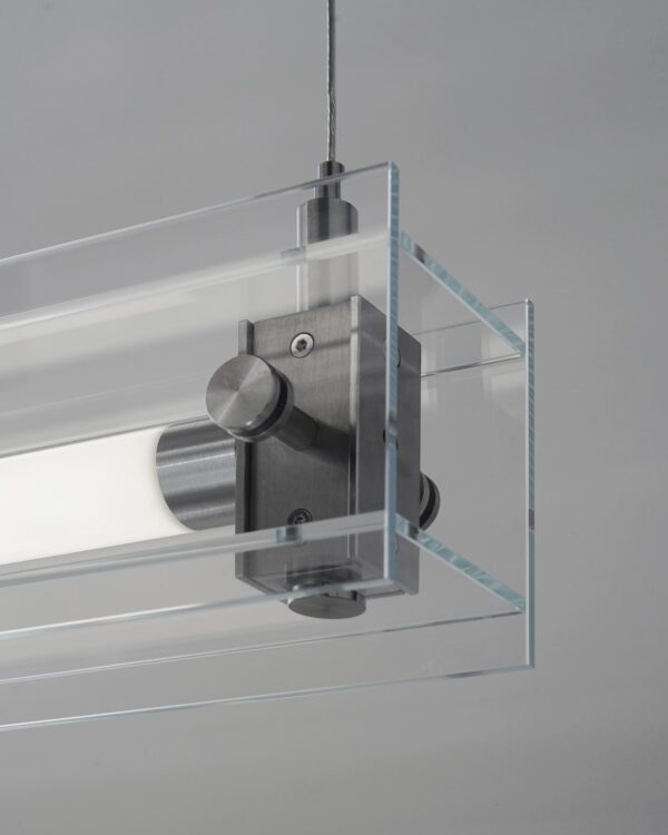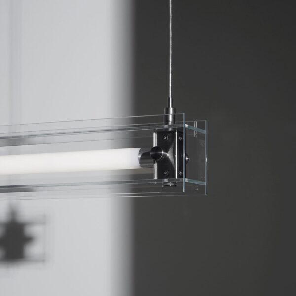 Inspired by water turning into ice, the way the lamp tube is held inside the outer glass resembles the freezing process. The clear glass not only adds depth beyond the frame but also highlights the floating design in a simple yet elegant way.